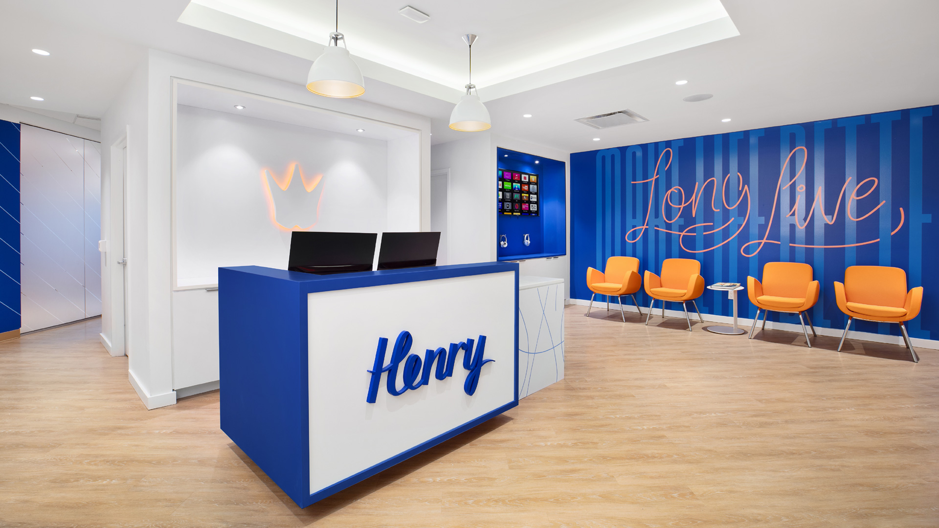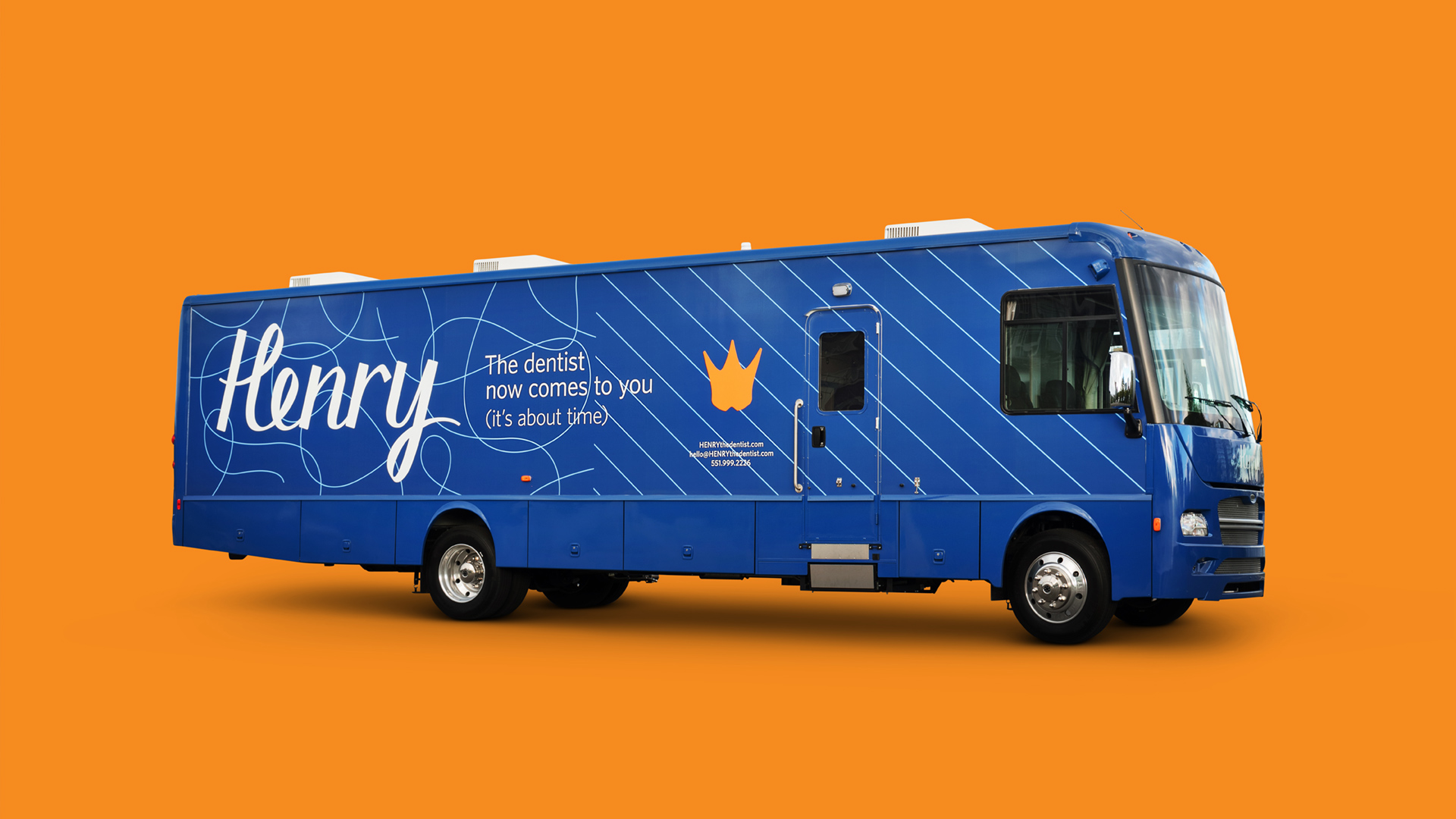 Henry reimagines the dental experience by rolling up to corporate offices with a state-of-the-art mobile practice. The mark references a crown, tooth and treating the customer like royalty. The bold color palette and playful use of abstract patterns throw away the notion that a clinic is often a cold and sterile place. The goal of the design is to change the perception that the dentist is “the last place I want to be or go back to”. Now that's what we call a crowning achievement!