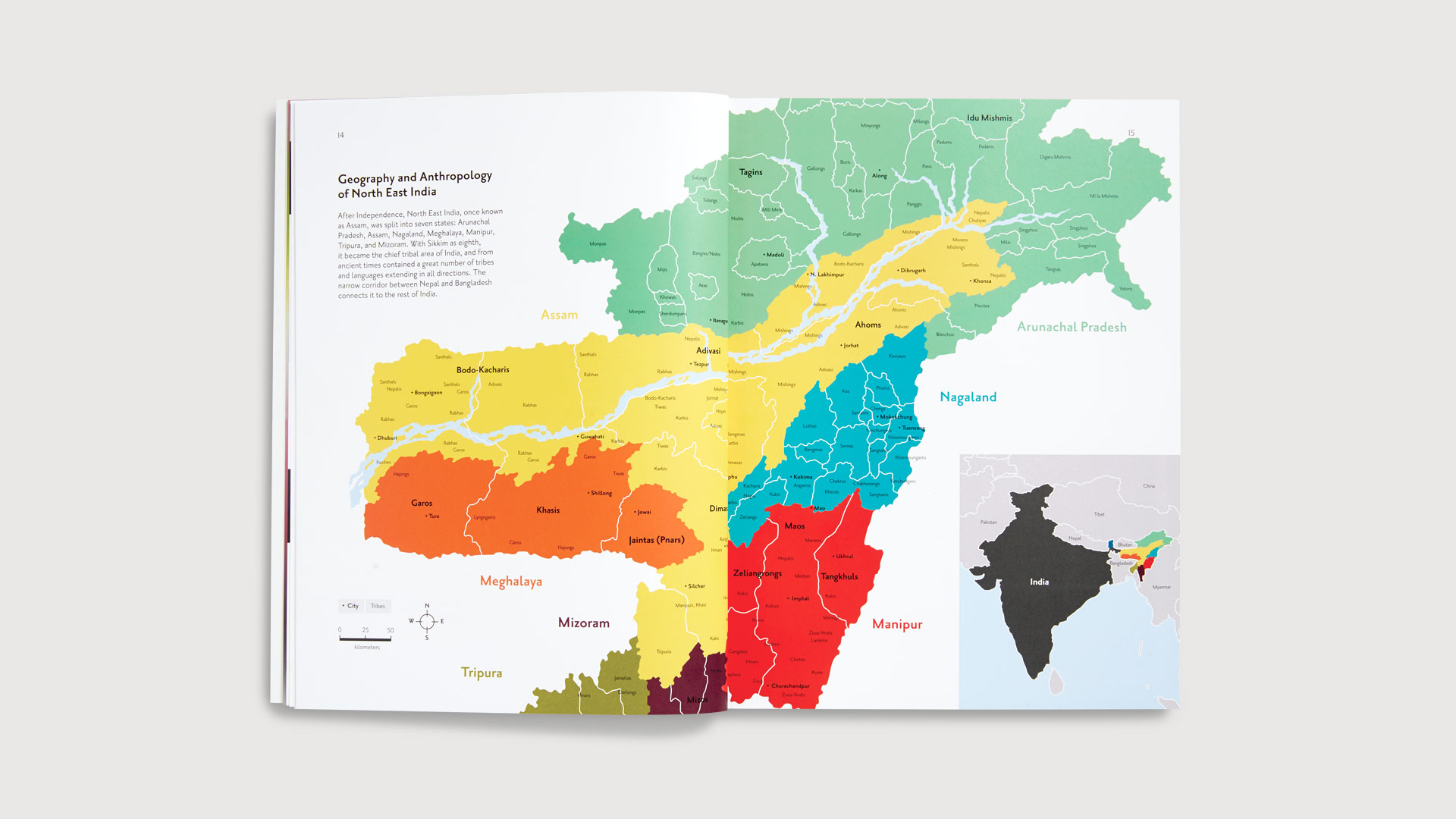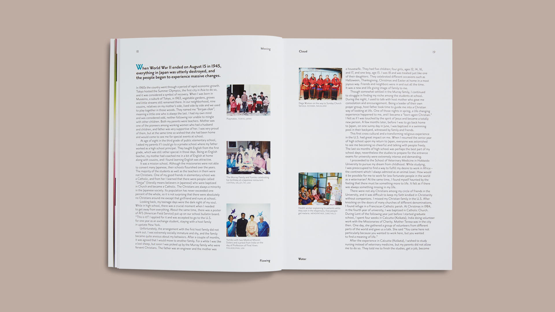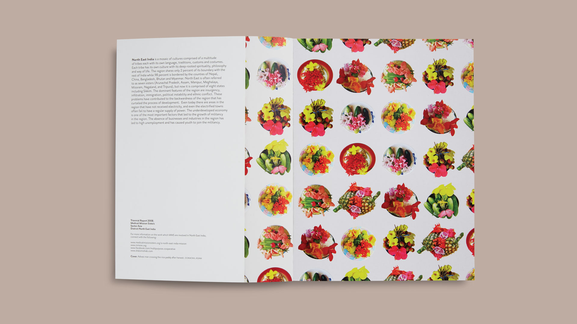 Book design for The Medical Mission Sisters, a community of women that offer care and compassion to millions of individuals globally. Our goal was to illustrate their record of the various connections between the people living in Northeast India, as well as showcase the mosaic of cultures in the relatively unexplored region. The various tribes each with its own language, traditions, customs and costumes were given equal importance through a poetic use of language, color (especially color), typography and scale.
